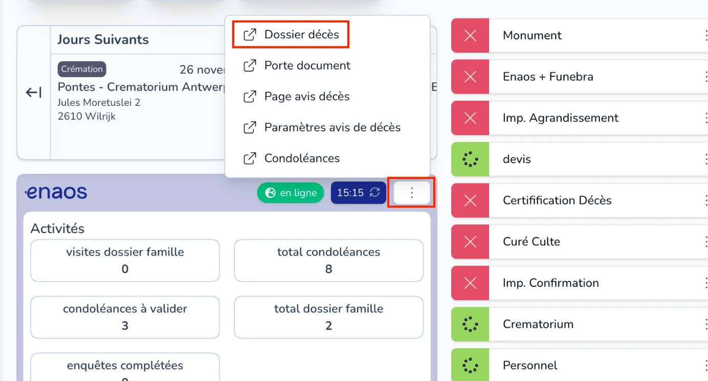 Pour cela, sélectionnez le défunt concerné sur Funeral Manager, cliquez sur les 3 points puis “Dossier décès” :