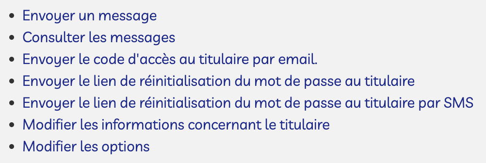 - Cliquer sur “Envoyer le lien de réinitialisation de mot de passe au titulaire” pour transmettre un nouvel e‑mail d’accès sécurisé ou “Envoyer le lien de réinitialisation de mot de passe au titulaire par SMS” pour lui transmettre par SMS. Le lien permet de se connecter sans connaître l’ancien mot de passe.
