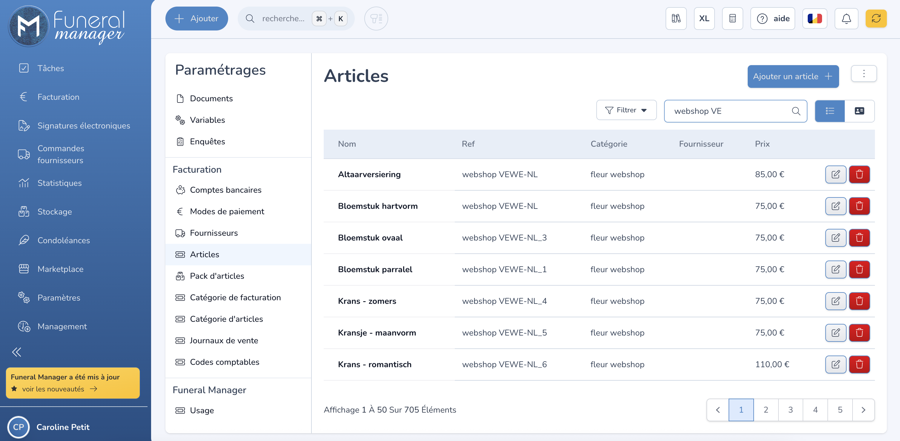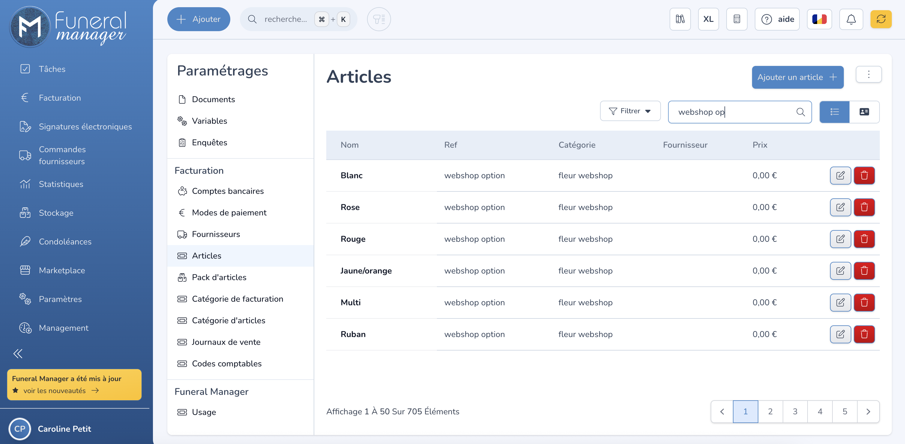 Elles sont créées depuis les paramètres des articles dans Funeral Manager. Vous pouvez les identifier grâce à la référence "webshop" ou à la catégorie "webshop flower". Ainsi, les fleurs de la boutique en ligne sont facilement identifiables et les ventes associées — notamment pour la facturation — peuvent être séparées du reste.