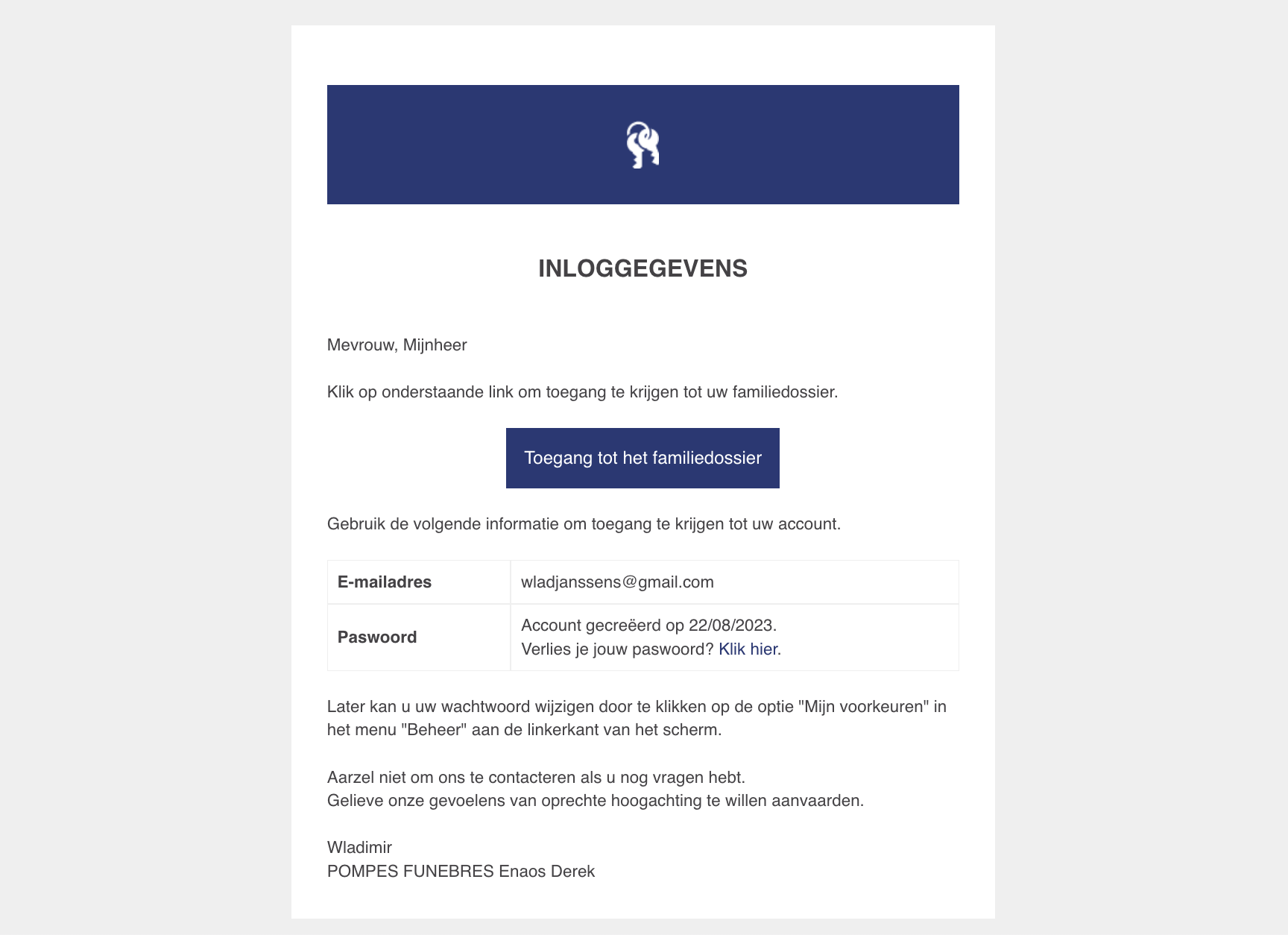 Wanneer de uitvaartconsulent een dossier voor een overledene aanmaakt, krijgt ieder geregistreerd familielid automatisch een uitnodiging om in te loggen in de familieruimte.