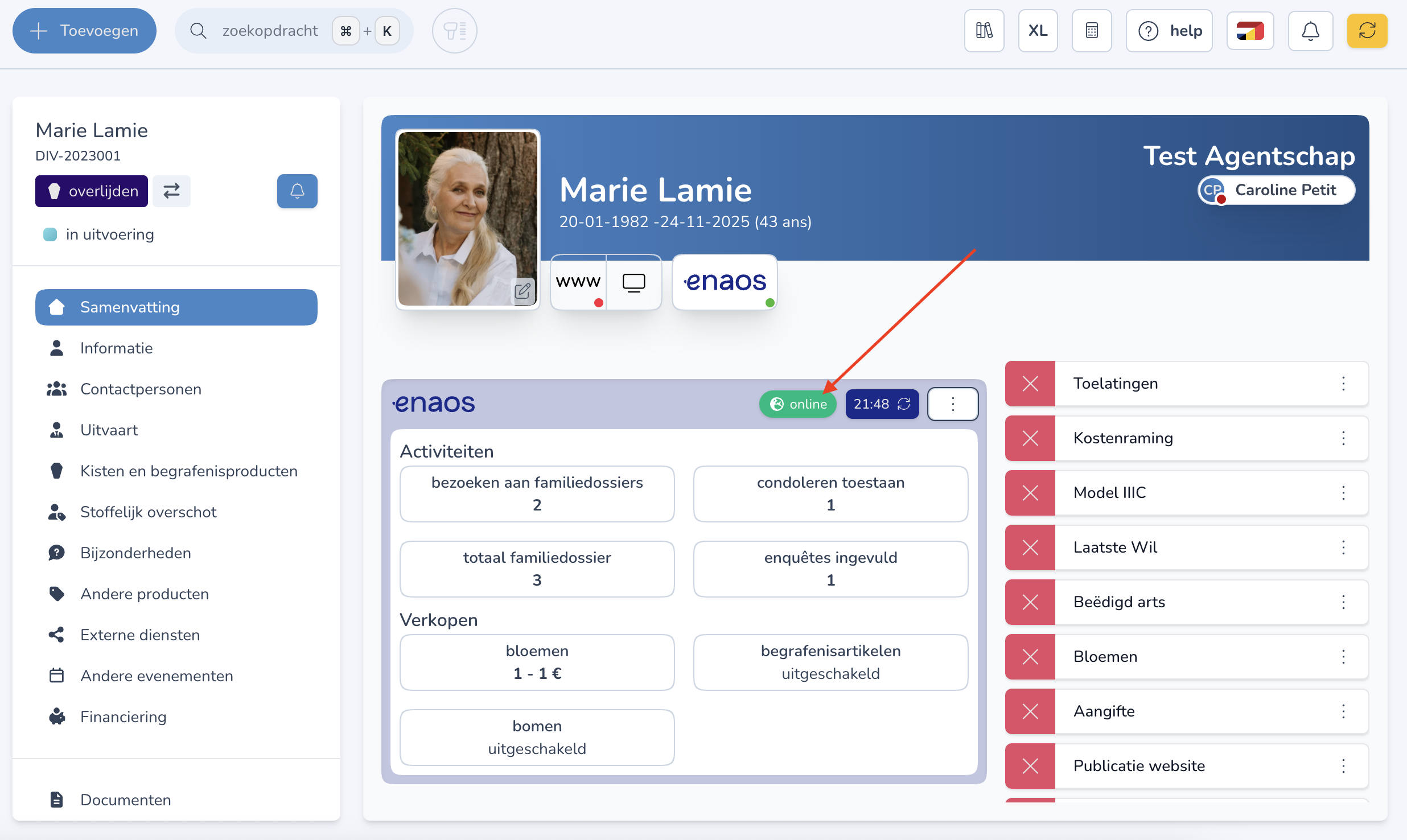 De Enaos-familieruimte kan perfect geactiveerd en gebruikt worden zonder dat het overlijdensbericht online komt.