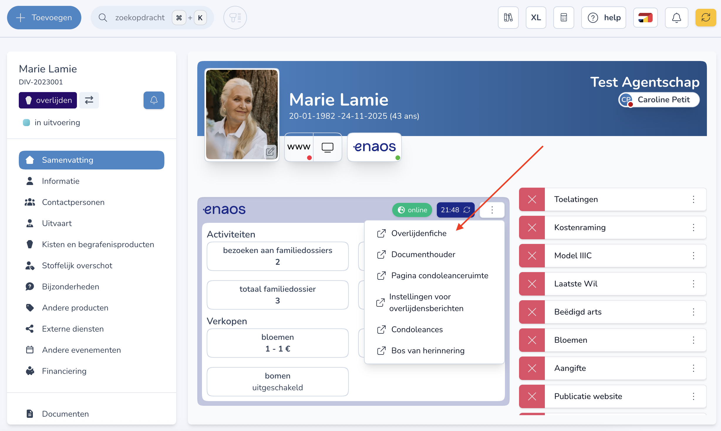 Ga in het dossier naar de drie puntjes … en kies “Overlijdensdossier”.