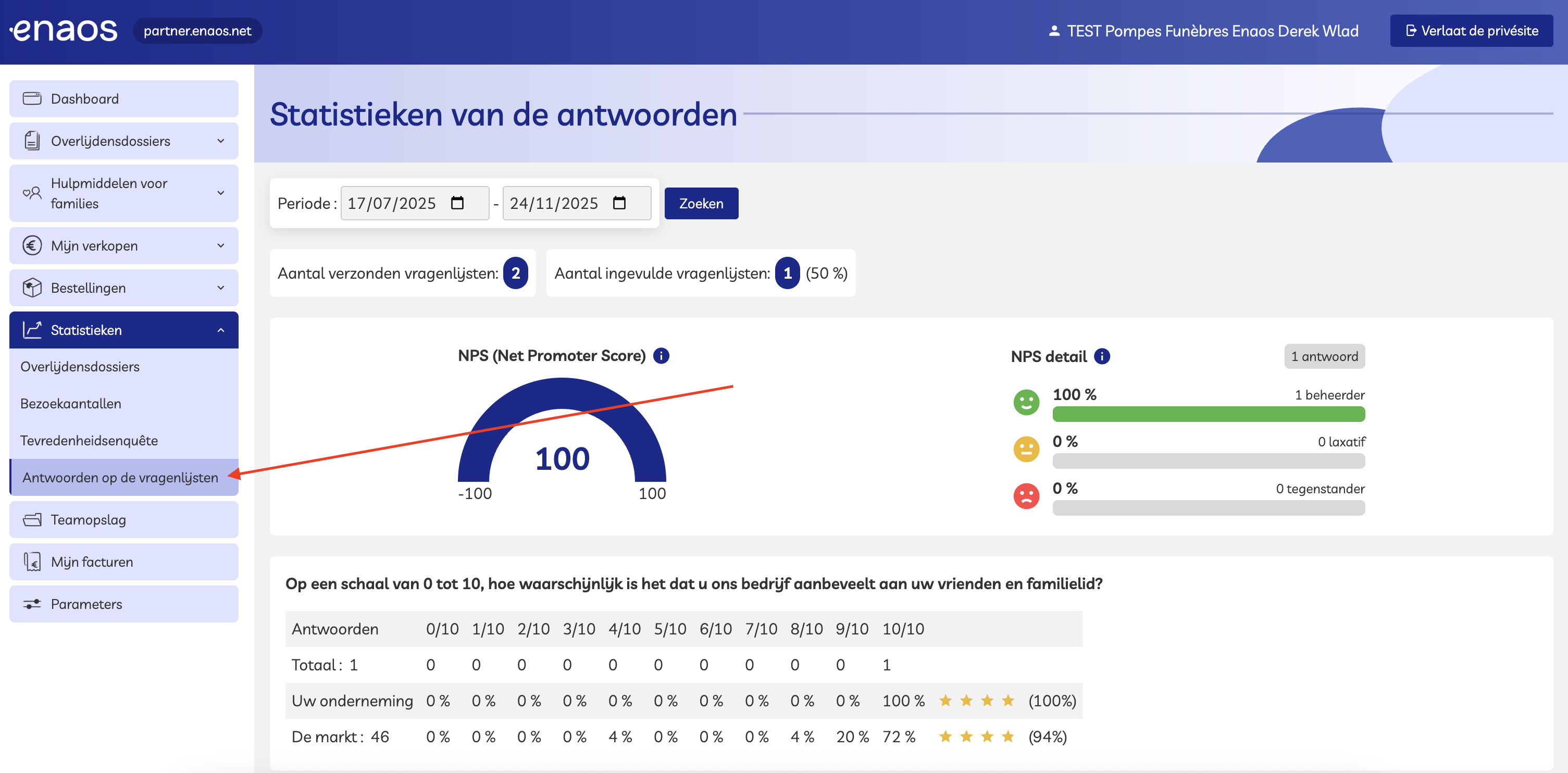 - Je kunt de antwoorden ook bekijken via Partner Enaos > tab “Statistieken” > “Antwoorden op vragenlijsten”, waar alle ingevulde enquêtes centraal worden opgelijst.